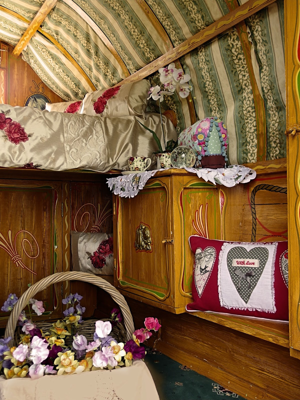 ....beautiful, isn't it? A bit twee perhaps but prettier than many of our modern homes. The Romany or Gypsy people have close links with the owners of fairground rides, "Showmen", they call themselves. They lived in wagons like this one.....